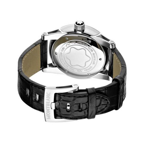42 mm stainless steel watch with black dial, red-gold plated hands and numerals, automatic movement, date display, black alligator-skin strap